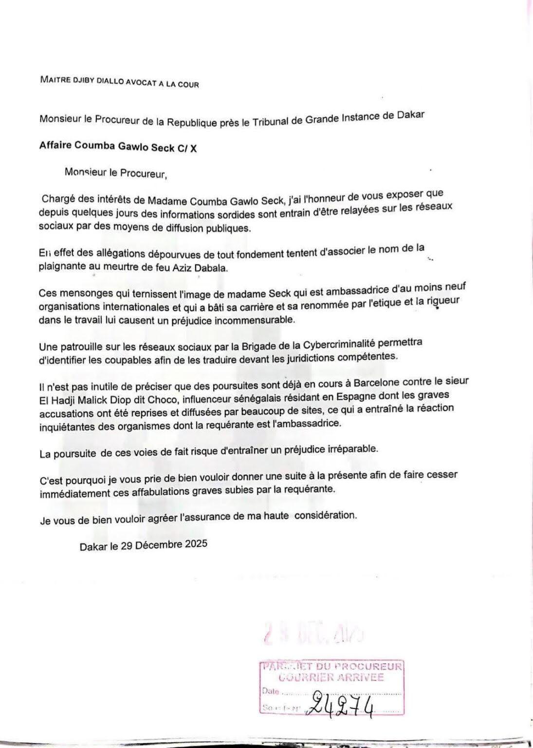 Agissant au nom de Madame Coumba Gawlo Seck, l'avocat déclare que depuis quelques jours, des informations sordides circulent sur les réseaux sociaux par des moyens de diffusion publiques. Ces allégations, totalement dépourvues de fondement, tentent d'associer le nom de sa cliente au meurtre de feu Aziz Dabala.