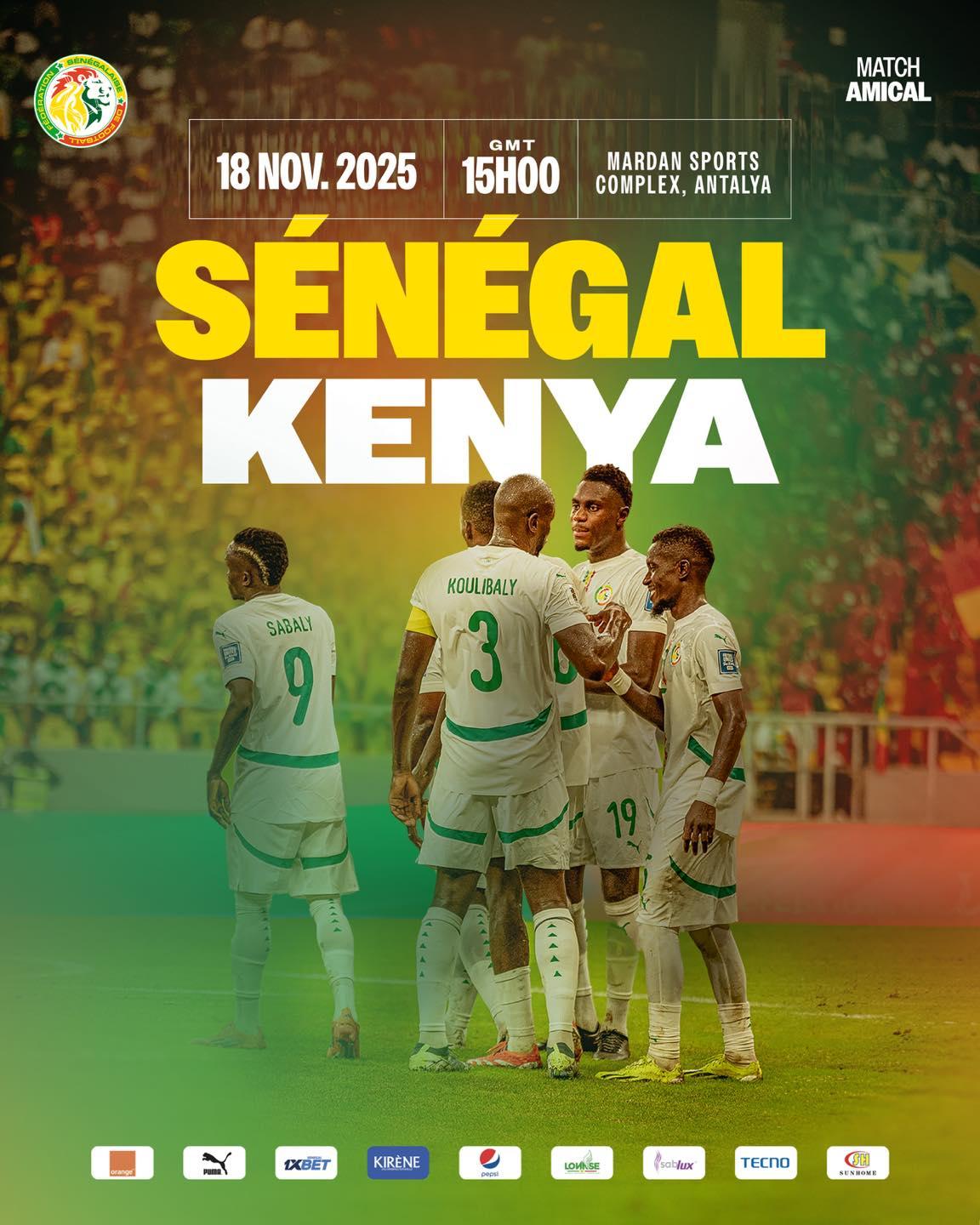 Après le Brésil (15 novembre à Londres), l'équipe du Sénégal aura un second match amical contre le Kenya. Cette opposition aura lieu le 18 novembre à 15h00 GMT au Mardan Sports Complex, à Antalya en Turquie.