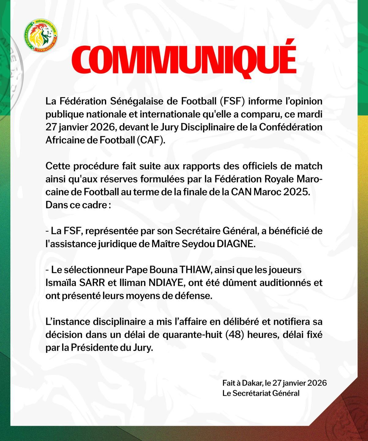 iGFM (DAKAR) La Fédération sénégalaise de football (FSF) a annoncé, dans un communiqué, avoir comparu, ce mardi, devant le jury disciplinaire de la Confédération africaine de football (CAF), à la suite des incidents survenus lors de la finale de la CAN 2025 remportée par les Lions face au Maroc (1-0).