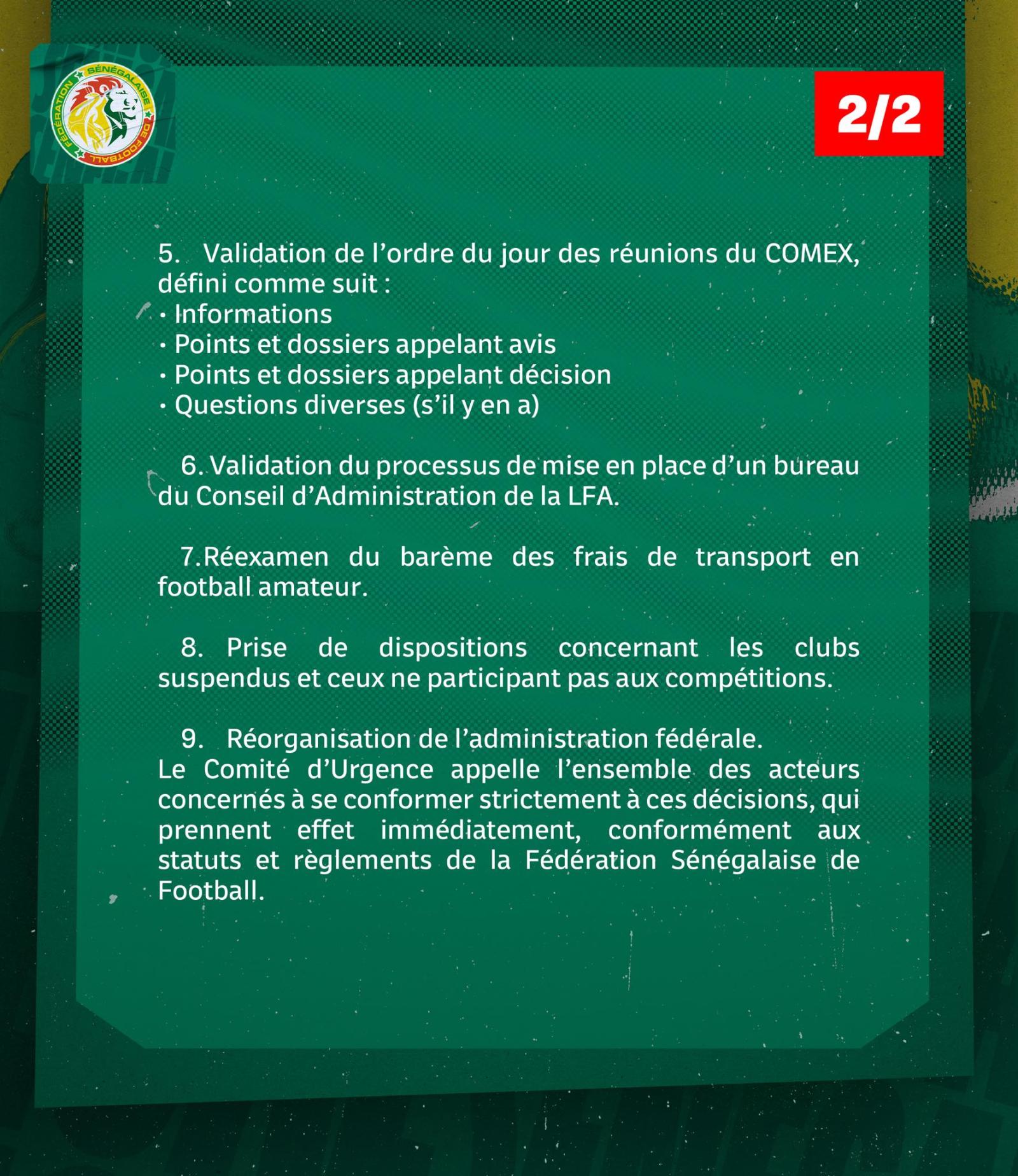 Parmi elles, on peut retenir, le lancement de la deuxième phase du projet du stade Demba Diop, avec une révision du mode de financement, la mise en place du bureau de facilitation, dédié à l'obtention du Fan-ID, installé au siège de la LSFP (Ligue sénégalaise de football professionnel) et surout le mandat donné au président de la commission juridique pour procéder à la nominatopn des membres des organes juridictionnels de la FSF.