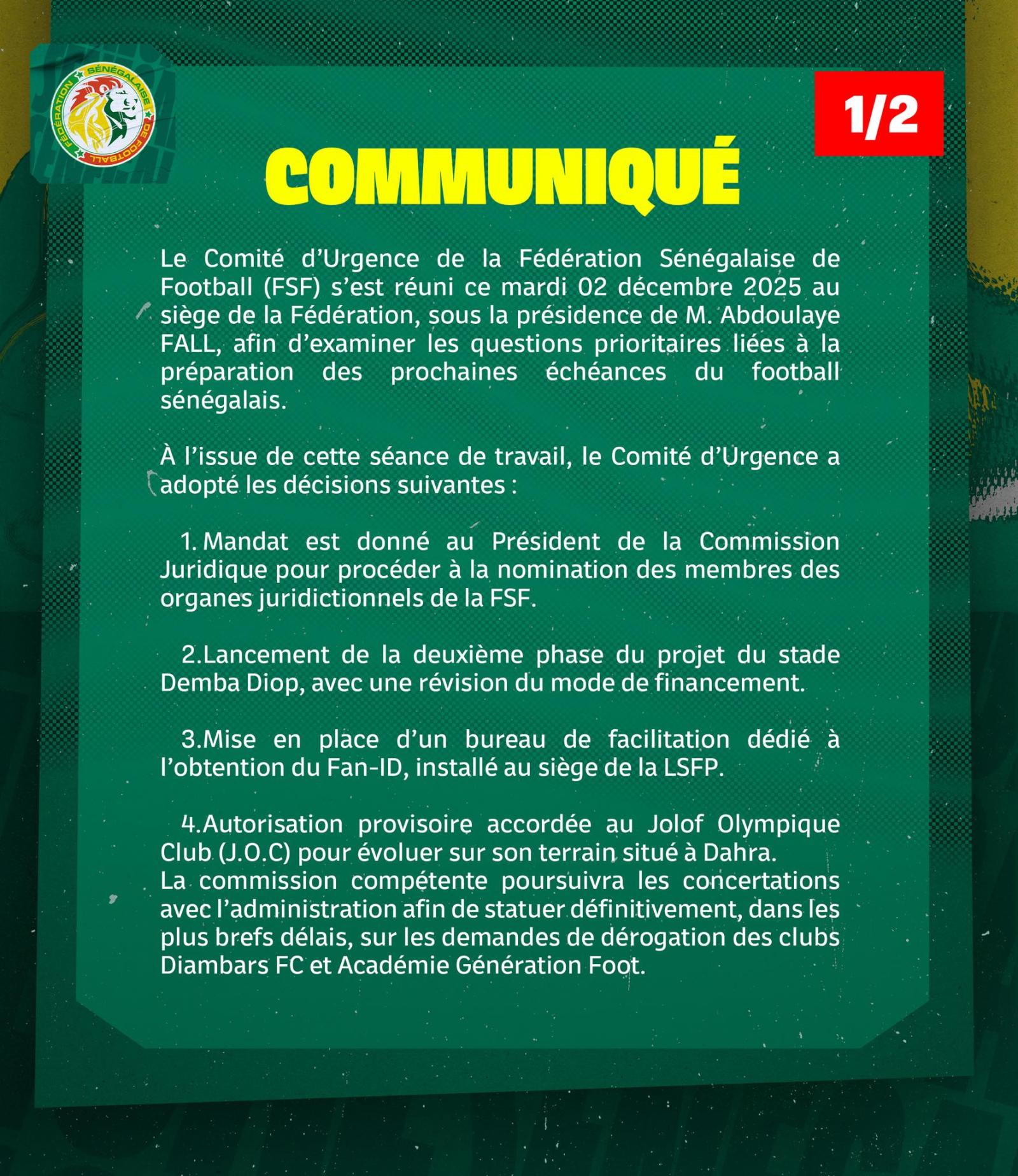 iGFM (Dakar) Le Comité d'urgence de la Fédération sénégalaise de football (FSF) a tenu sa toute première réunion, ce mardi 02 décembre 2025, au siège de l'instance.
