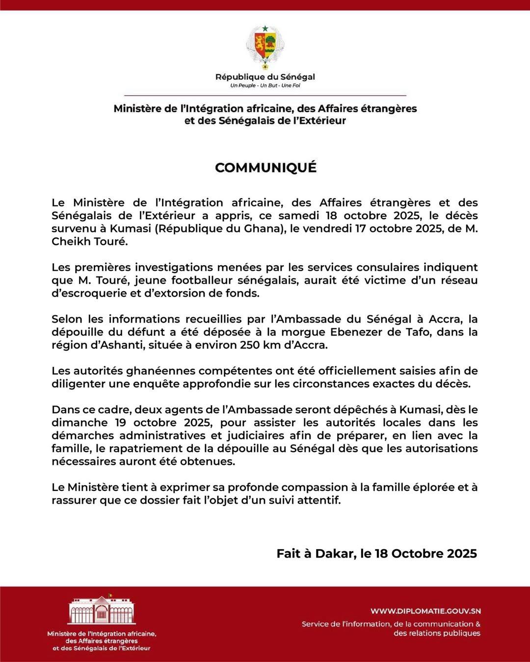 iGFM (Dakar) Suite au décès tragique du jeune joueur sénégalais, Cheikh TOURÉ au Ghana, le ministère de l'Intégration Africaine, des Affaires étrangères et des Sénégalais de l'Extérieur, a réagi via un communiqué, ce samedi.