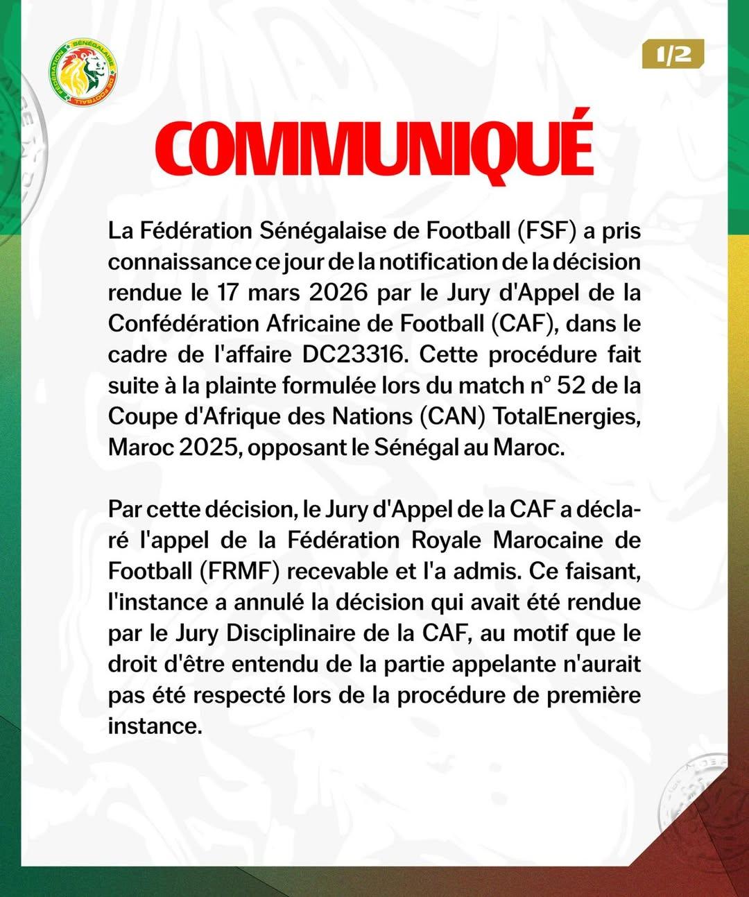 "La Fédération Sénégalaise de Football (FSF) a pris connaissance ce jour de la notification de la décision rendue le 17 mars 2026 par le Jury d’Appel de la Confédération Africaine de Football (CAF), dans le cadre de l’affaire DC23316. Cette procédure fait suite à la plainte formulée lors du match n° 52 de la Coupe d’Afrique des Nations (CAN) TotalEnergies, Maroc 2025, opposant le Sénégal au Maroc.
