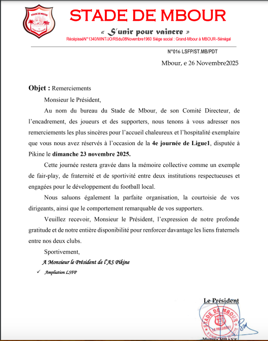 iGFM (Dakar) Le Stade de Mbour a remercié chaleureusement l'AS Pikine pour l'accueil exemplaire lors du match comptant pour la 4e journée de Ligue 1, disputé au stade Alassane Djigo.