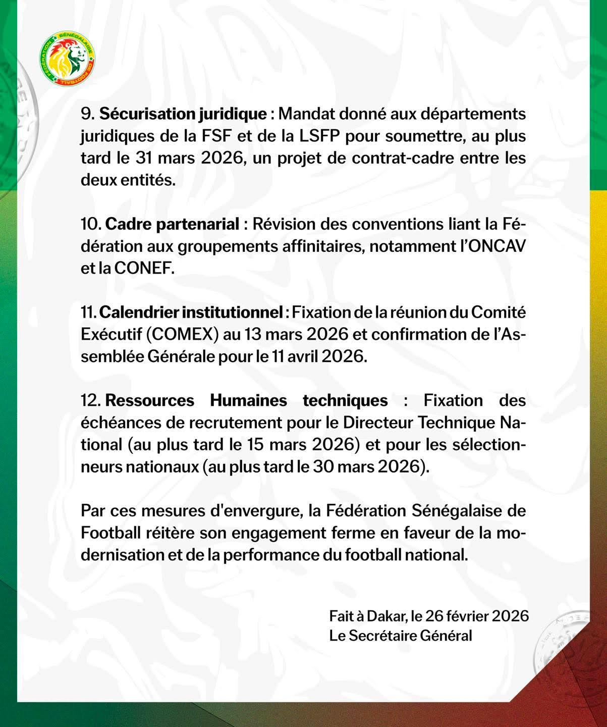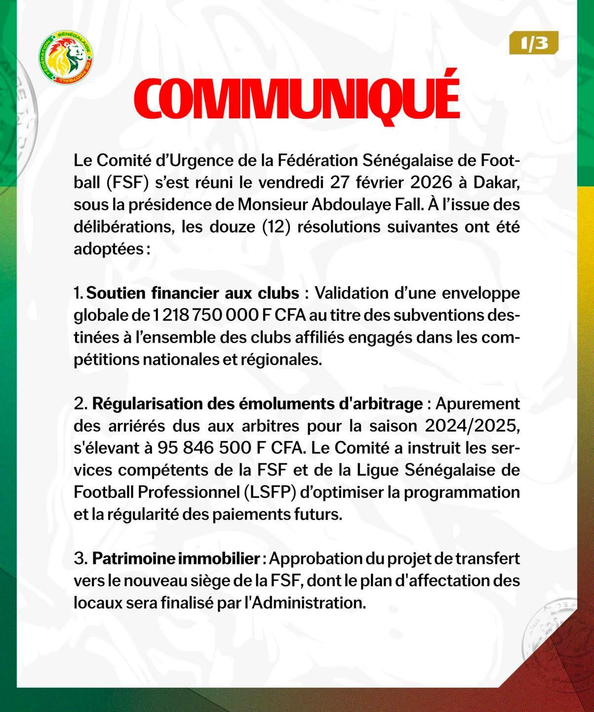 iGFM (Dakar) 12 résolutions ont été adoptées par le Comité d'Urgence de la Fédération sénégalaise de football (FSF) à l’issue de la réunion tenue le vendredi 27 février 2026. Ci-dessous le communiqué officiel de la FSF.