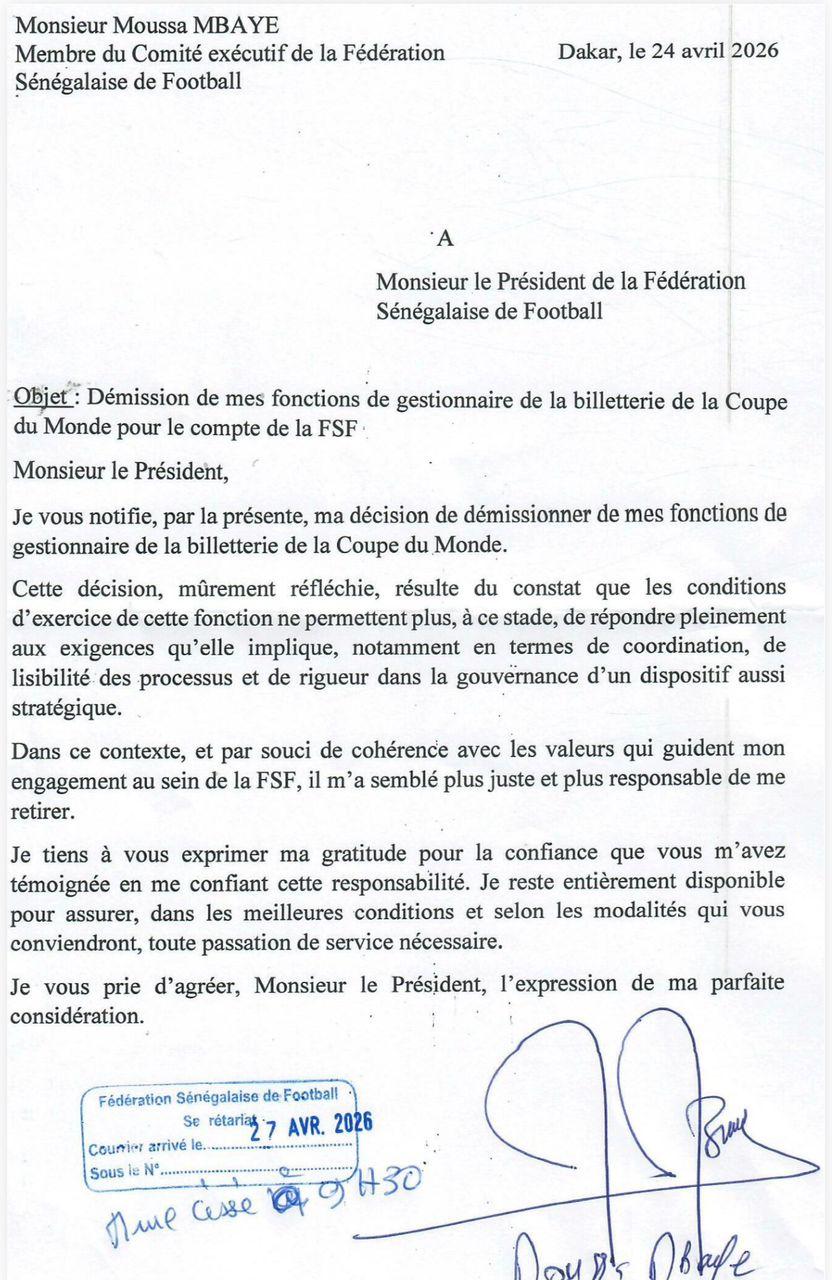 iGFM (Dakar) Moussa Mbaye, membre du Comité exécutif de la Fédération sénégalaise de football (FSF), a démissionné de ses fonctions de gestionnaire de la billetterie de la Coupe du monde FIFA 2026. Contacté par IGFM, le dirigeant a confirmé l'information.