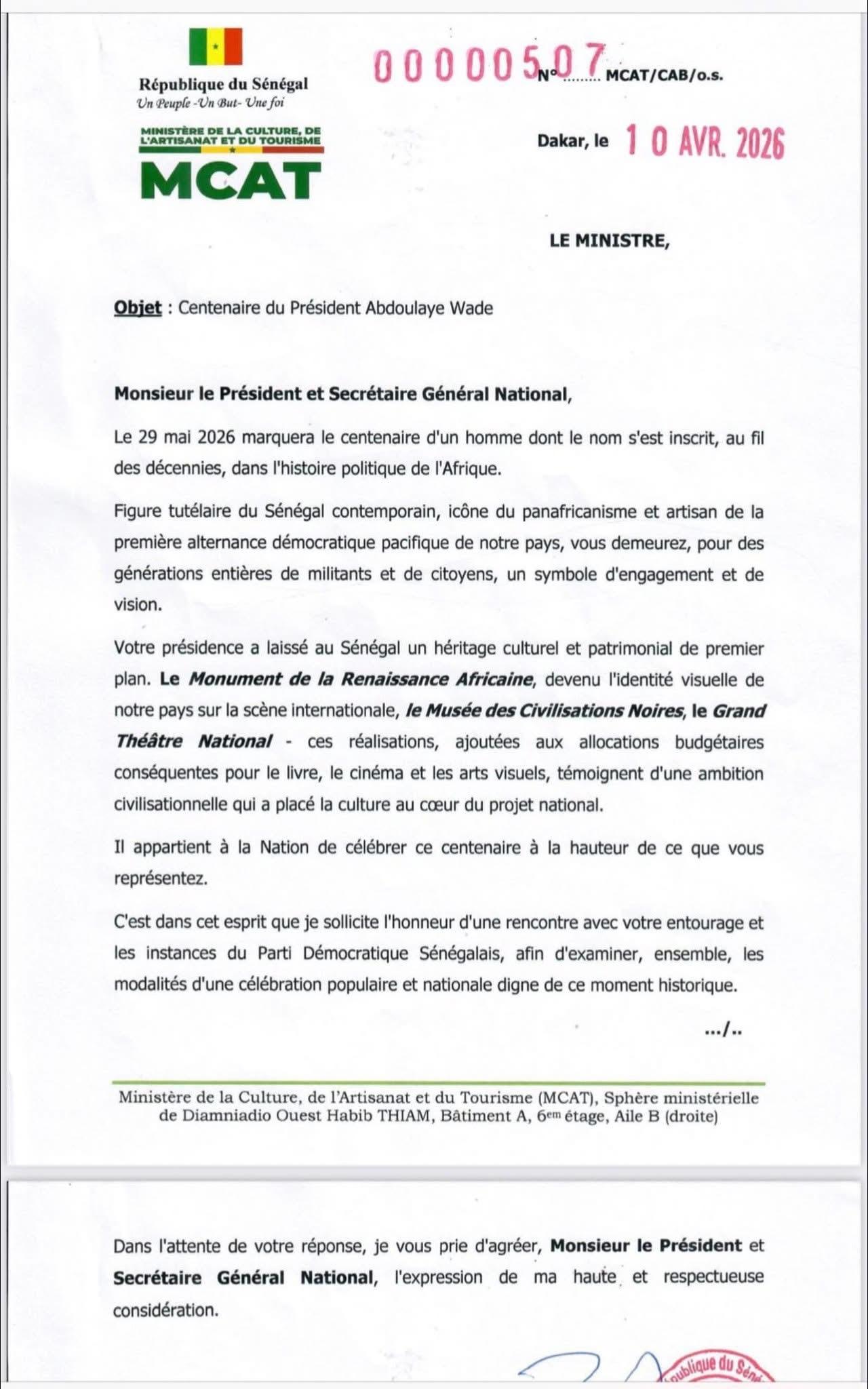 Estimant qu’« il appartient à la Nation de célébrer ce centenaire à la hauteur de ce que vous représentez », le ministre de la Culture sollicite « l’honneur d’une rencontre avec votre entourage et les instances du Parti Démocratique Sénégalais ». Objectif : examiner ensemble les modalités d’une célébration populaire et nationale digne de ce moment historique.