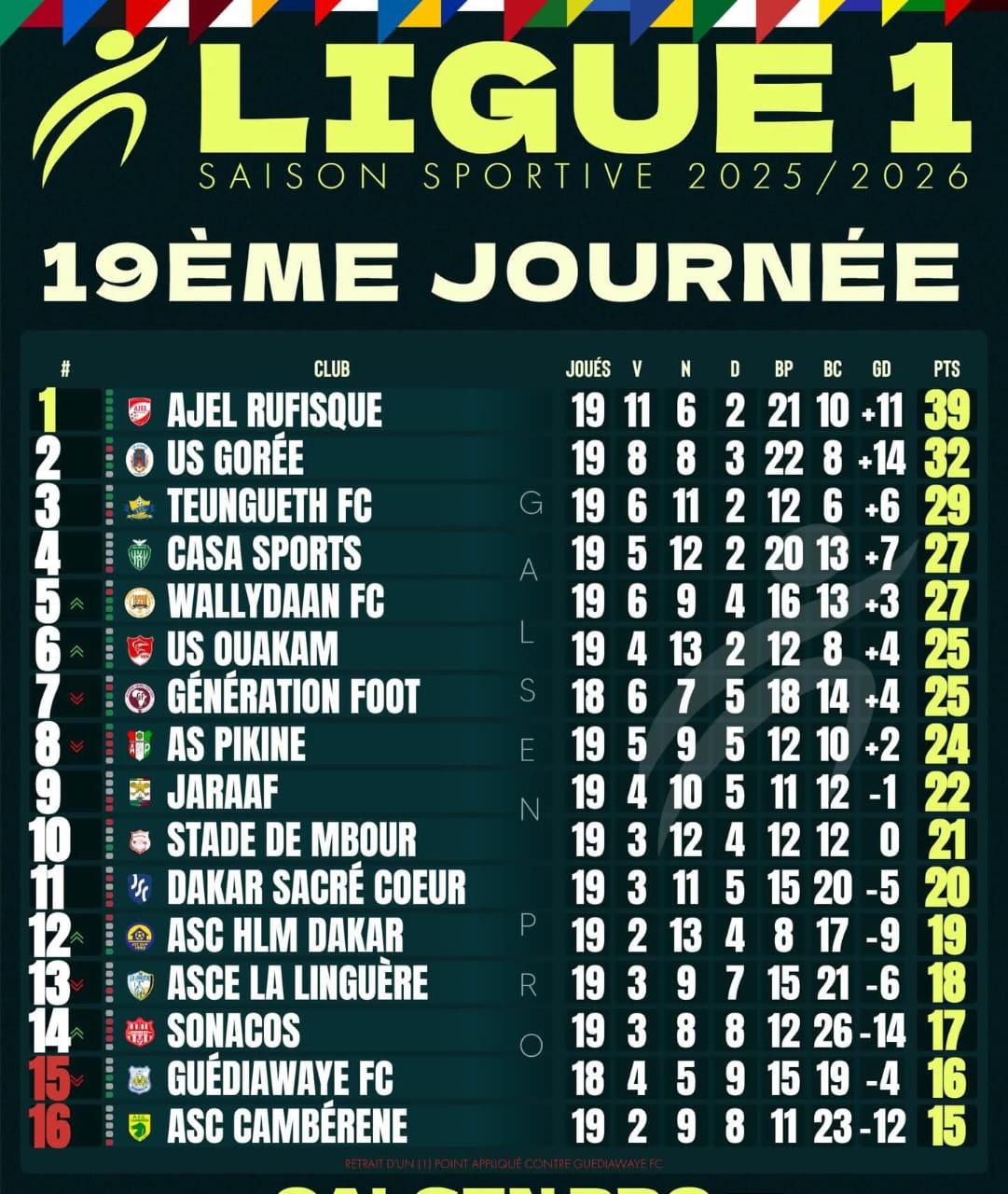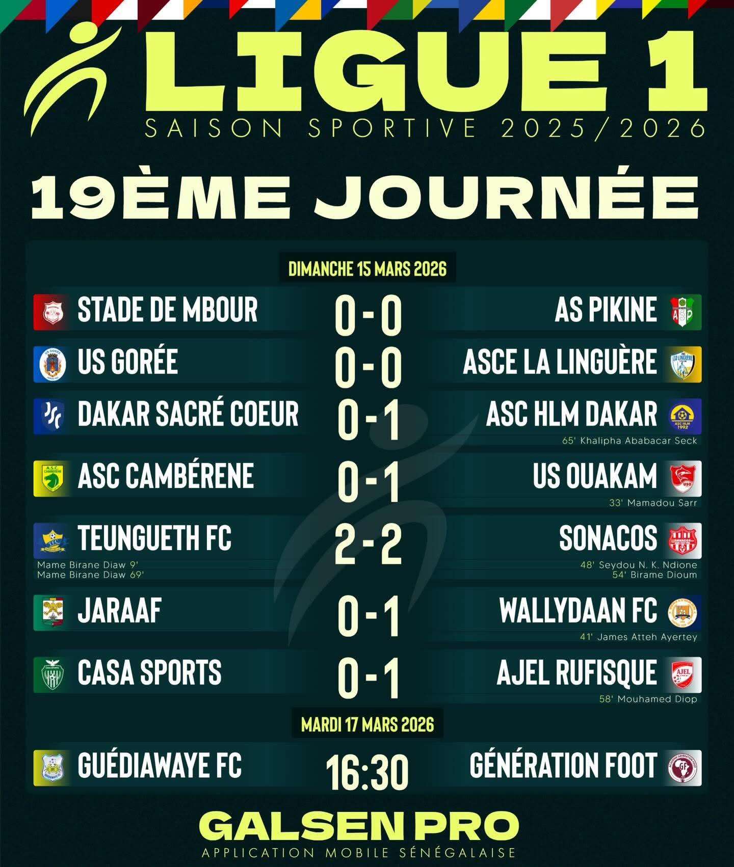 La 19e journée sera bouclée, mardi avec le duel Guédiawaye FC-Génération Foot au stade Amadou Barry.