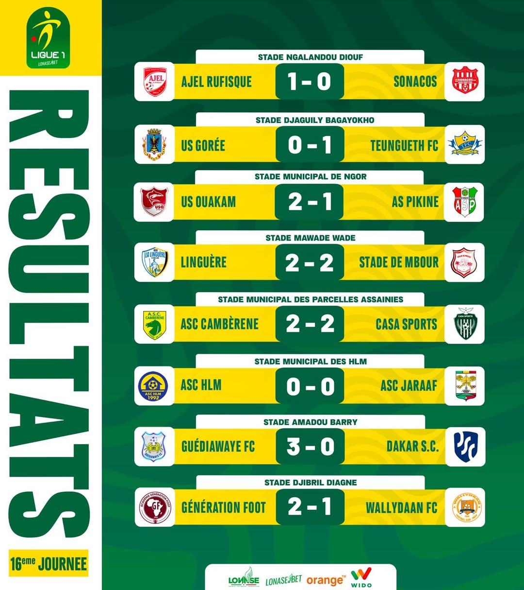 D'autres résultats sont enregistrés ce jour. L'US Ouakam, Guédiawaye FC et Génération Foot ont respectivement battu l'AS Pikine (2-1), Dakar SC (3-0) et Wallydaan (2-1).