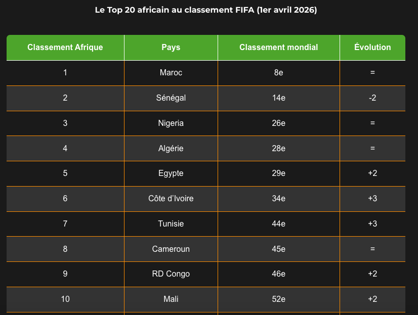 Paradoxalement, malgré ses victoires face au Pérou (2-0) et à la Gambie (3-1), le Sénégal, champion d’Afrique 2025 même si la CAF s'y est opposée de manière illégale, perd deux places au niveau mondial en raison de cette décision du jury d'appel, controversée. Le Sénégal descend à la 14e place mais reste 2e du podium africain avec une avance confortable sur le Nigeria, 3e.