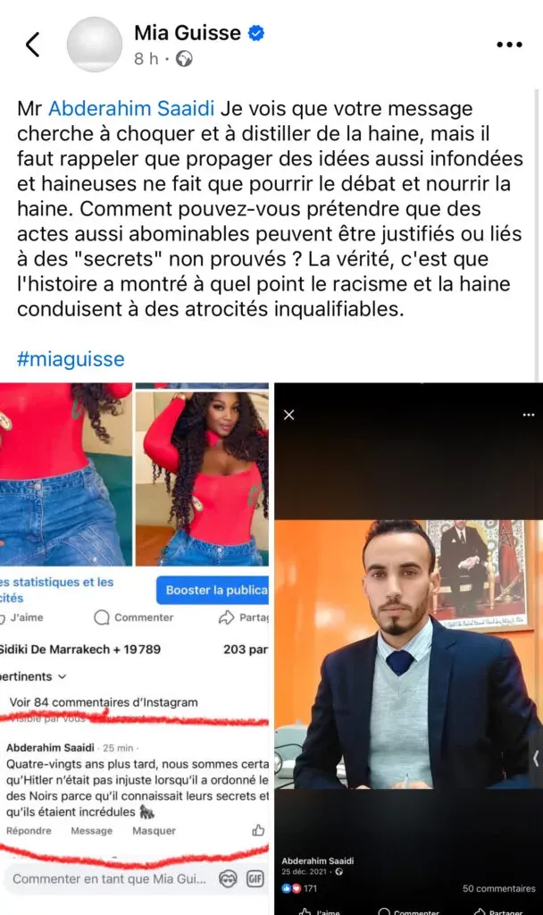 L’incident est survenu suite au message posté par l’artiste pour saluer la performance de l’équipe nationale. Si la majorité des interactions sont restées courtoises, un commentaire signé par un internaute identifié comme Abderahim Saaidi a tranché par sa violence. L’auteur a proféré des insultes à caractère raciste, allant jusqu’à évoquer la figure d’Adolf Hitler pour appuyer des propos haineux visant la communauté noire.