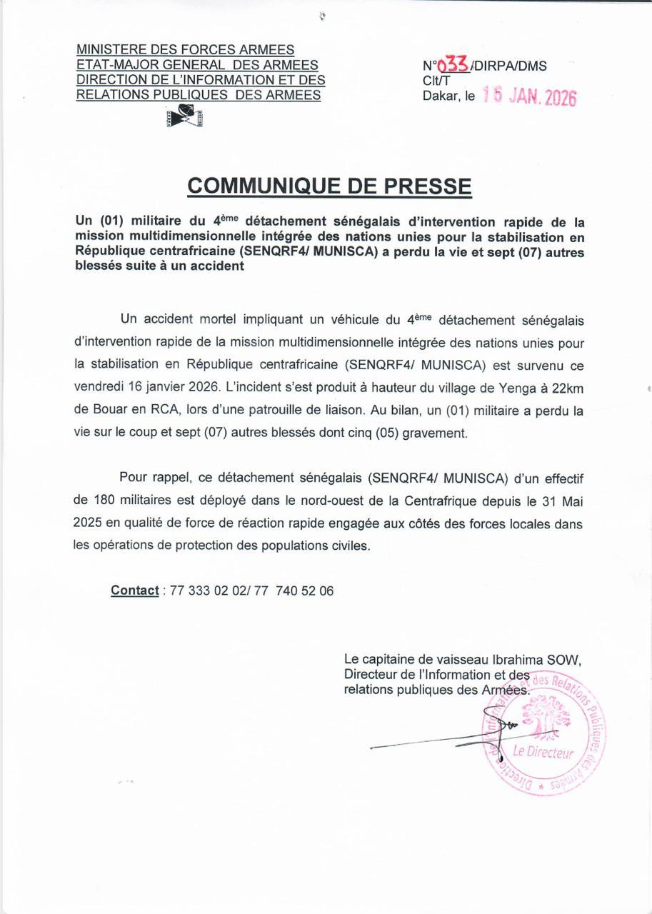 L’armée sénégalaise est en deuil. En effet, selon la Direction des relations publiques des armées, un militaire du 4ème détachement sénégalais d'intervention rapide de la mission multidimensionnelle intégrée des nations unies pour la stabilisation en République centrafricaine (Munisca) a perdu la vie, tandis que sept autres ont été blessés.