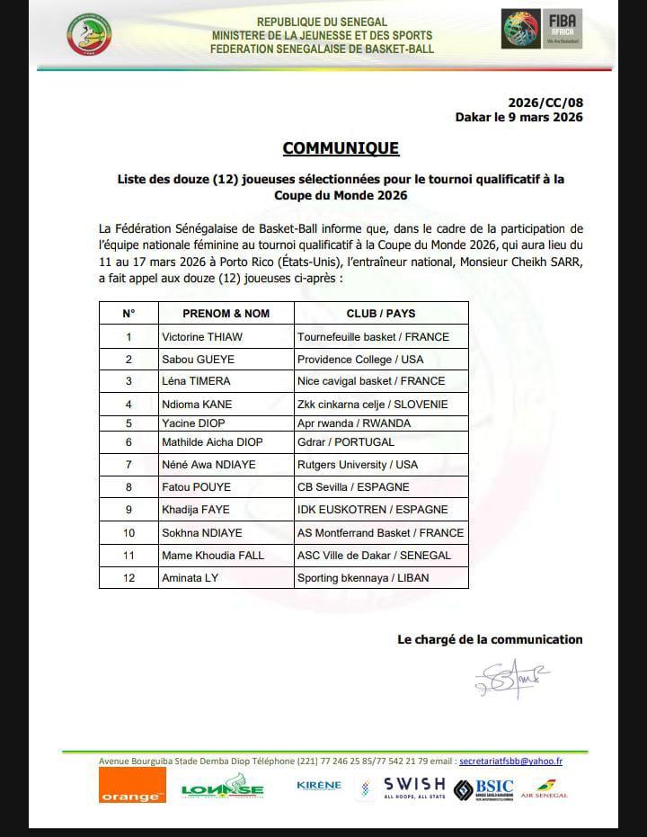 iGFM (Dakar) À deux jours du coup d'envoi des éliminatoires de la Coupe du monde de basket 2026, le sélectionneur national Cheikh SARR a réduit sa liste de 13 à 12 joueuses. Marie Diamé a été recalée malgré le voyage effectué avec le groupe à Porto Rico.
