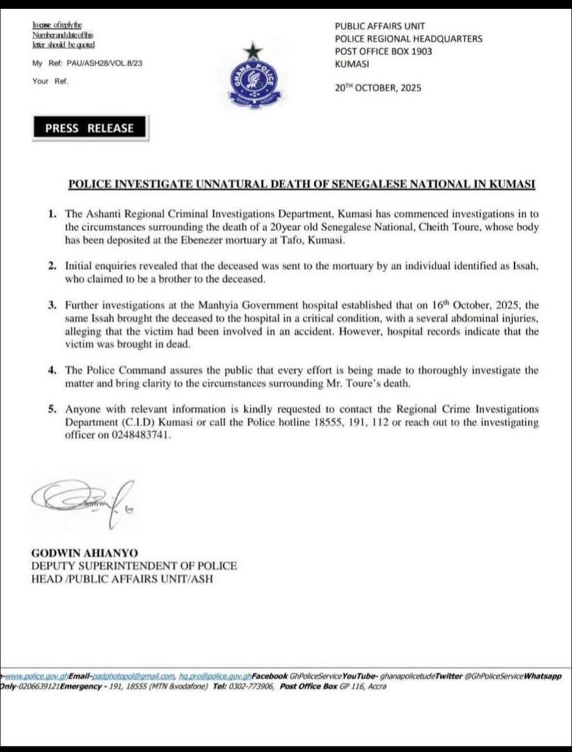 On en sait un peu plus sur la mort tragique de Cheikh Touré. En effet, selon JDD, le département régional des investigations criminelles d’Ashanti a appris, dans un communiqué, qu’un nommé Issah qui s’est présenté comme son frère l’a conduit à l’hôpital public de Manhyia le 16 octobre. Il était à cet instant dans un « état critique », en ce qu’il présentant des « blessures abdominales ». Ce dernier a indiqué aux blouses blanches que le footballeur avait été impliqué d’un accident. C’est d’ailleurs lui qui l’a conduit à la morgue d’Ebenezer, à Tafo (région d’Ashanti). Les investigations se poursuivent, un numéro ayant été mis à la disposition de toute personne pouvant disposer d’informations.