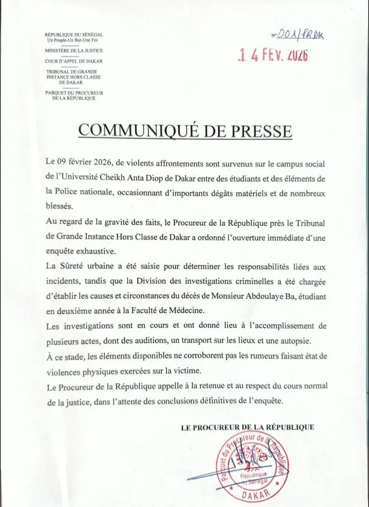 Face à la gravité des faits, le Procureur de la République a ordonné l’ouverture immédiate d’une enquête exhaustive. La Sûreté urbaine a été saisie afin de déterminer les responsabilités liées aux incidents, tandis que la Division des investigations criminelles a été chargée d’établir les causes et circonstances du décès de Monsieur Abdoulaye Ba, étudiant en deuxième année à la Faculté de Médecine.