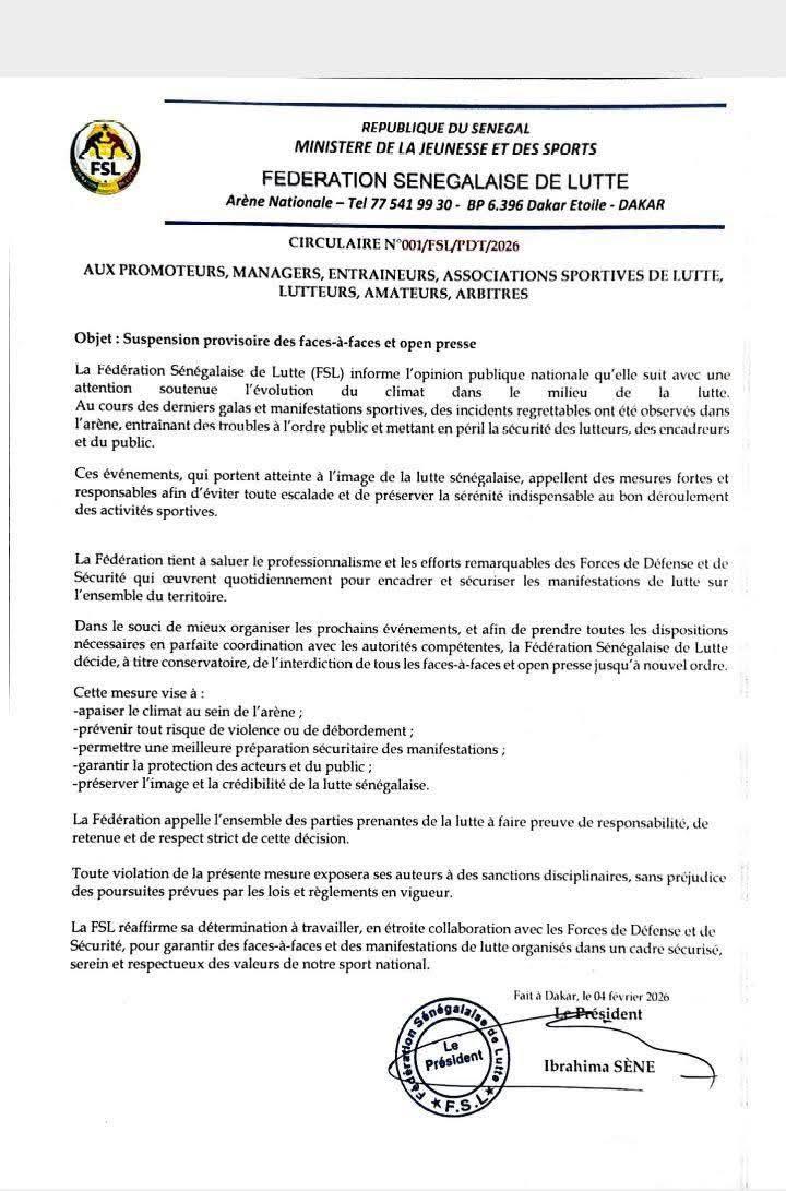 iGFM (Dakar) Les Open Press et les face à face des lutteurs sont interdits jusqu’à nouvel ordre, indique un communiqué de la Fédération sénégalaise de Lutte.