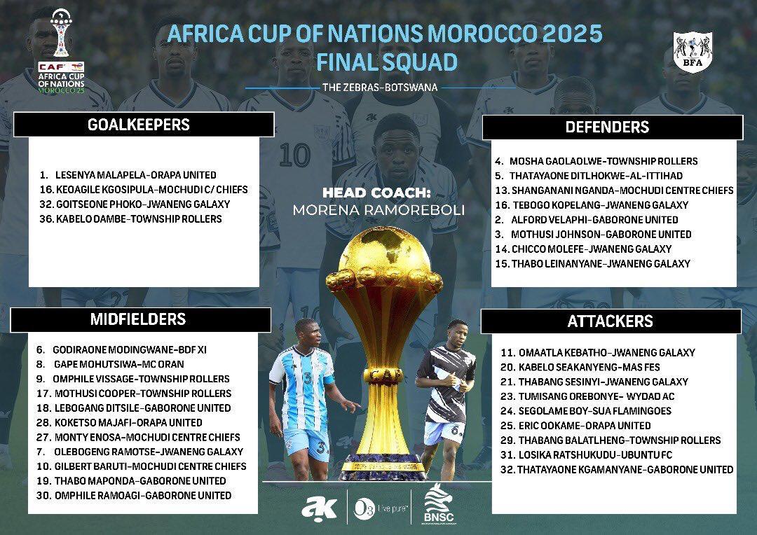 iGFM (Dakar) Premier adversaire du Sénégal à la Coupe d'Afrique des Nations Maroc 2025 (21 décembre-18 janvier 2026), le Botswana a retenu une liste de 32 joueurs pour la préparation. Quatre réservistes sont prévus. Ce qui fait 36 joueurs soit 32 convoqués.