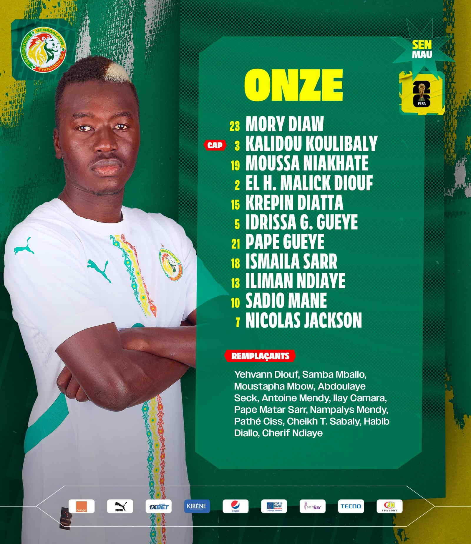 iGFM (DAKAR) Découvrez la composition officielle de l'équipe du Sénégal qui va démarrer contre la Mauritanie, ce soir, dans un match comptant pour la 10e et dernière journée des éliminatoires de la Coupe du monde 2026.