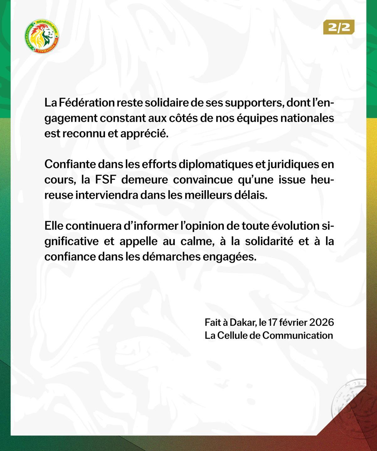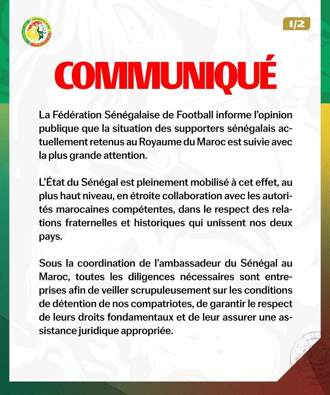 iGFM (Dakar) Dans un Communiqué publié, ce mardi vers 17 heures, la Fédération sénégalaise de football (FSF) a fait le point sur la situation des 18 supporters sénégalais détenus au Royaume du Maroc depuis la finale de la CAN 2025.