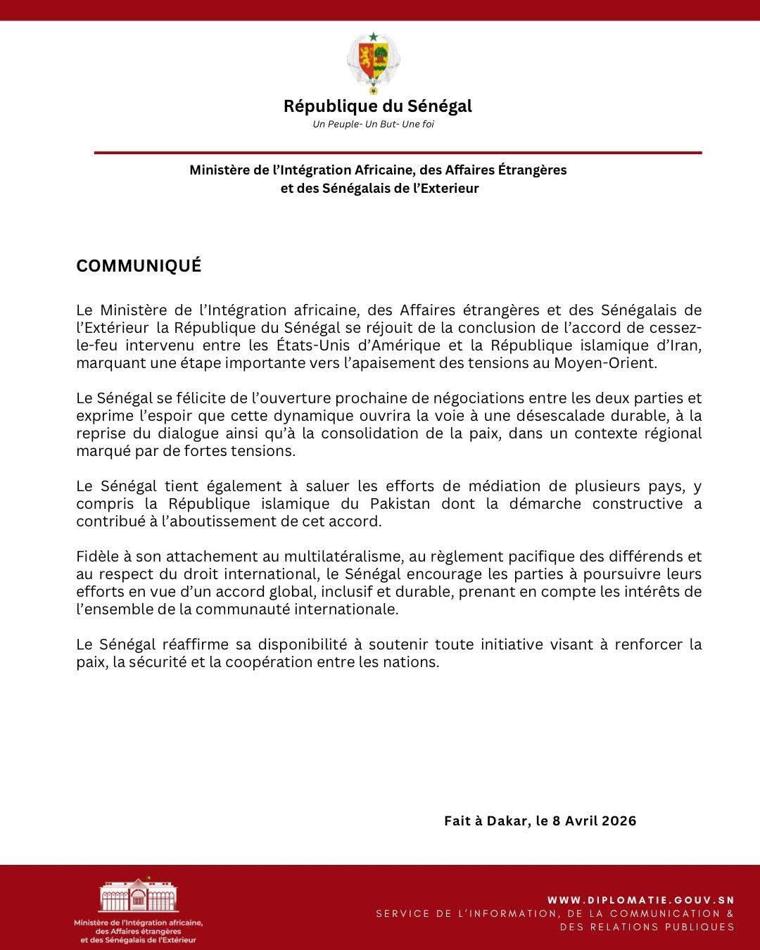 iGFM – (Dakar) Le Ministère de l’Intégration africaine, des Affaires étrangères et des Sénégalais de l’Extérieur de la République du Sénégal a publié un communiqué pour saluer la conclusion de l'accord de cessez-le-feu entre les États-Unis d’Amérique et la République islamique d’Iran. Cette étape importante marque un apaisement des tensions au Moyen-Orient.